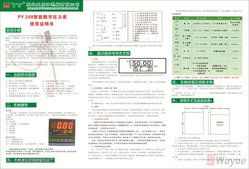 歡迎您選用湖北五岳傳感器有限公司生產(chǎn)的PY208/PY808智能數(shù)字壓力儀表。該說明書詳細的介紹了PY208/PY808的性能特點,參數(shù)指標,使用方法,維護保養(yǎng)等內(nèi)容。使用前仔細閱讀本說明書,以便您正確使用。