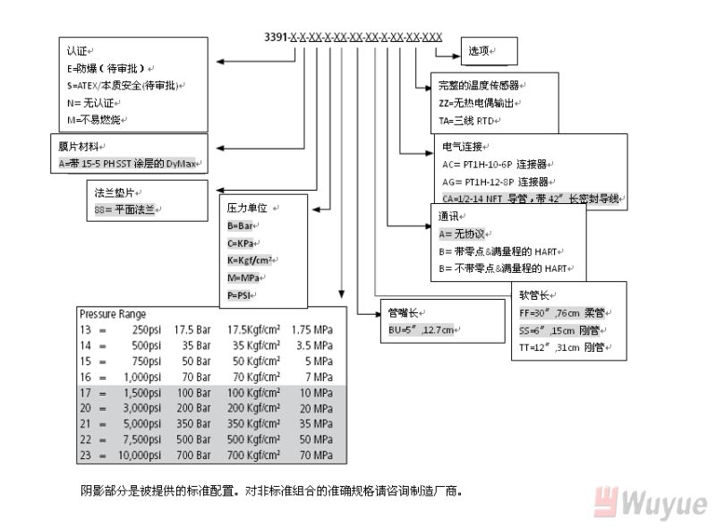 輸出,模擬:4-20mA(標準壓力,溫度可選) 輸出,數(shù)字:HART 綜合精度(錯誤)(20-100%滿量程): ±0.15%滿量程(3M和3M以上) +0.25%滿量程(1.5M和1.5以下) 溫度漂移(77-572℉,25-300℃):0.001%滿量程/℉,最大(0.001%滿量程/℃,最大) 重復性:±0.1%滿量程 爆破額定壓力:2X滿量程 超壓 額定:1.5X滿量程 量程:1,500至10,000psi 可調(diào)范圍:6:1調(diào)節(jié)比,向下 負載電阻:250歐姆@18Vdc;500歐姆@23Vdc |